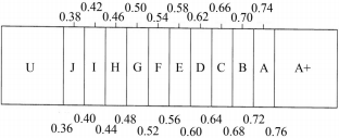 簡單來說,語音傳輸指數(shù)是衡量語音傳輸質(zhì)量的一個指標,該參數(shù)可以較為全面反映混響時間、信噪比和回聲等對語言清晰度的影響,并且考慮了系統(tǒng)失真、心理聲學效果(掩蔽效應)等因素。它的值范圍為0~1,值越大說明清晰度越好。好的擴聲系統(tǒng)即使用在聲學條件較差的環(huán)境也能達到0.45到0.65的結(jié)果,而在聲學環(huán)境較好的場所,能達到0.70至0.90。更直觀的例子是,一間優(yōu)秀的錄音棚內(nèi),從麥克風到監(jiān)聽音箱之間典型的STI值能達到0.90至0.97。圖1所示為評定等級,圖中字母為等級名稱,上面數(shù)字代表該等級的STI中心值,下面數(shù)字代表該等級的STI邊界值。A+是極高的語言可懂度,A、B和C是高的語言可懂度,D是較好的語言可懂度,E是高品質(zhì)的擴聲系統(tǒng),F(xiàn)是較好品質(zhì)的擴聲系統(tǒng),G是語音報警系統(tǒng)的目標值,H是語音報警系統(tǒng)的正常下限,I是有限的語言可懂度,J和U是STI值太低,不宜用于擴聲系統(tǒng)。