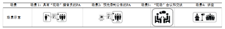 需要STI測試的可能場景有4種,如表3所示,其中確定了傳輸通道、說話者和收聽者。場景1與場景4基本相同,都是測量時說話者通過傳聲器到擴聲系統(tǒng),再由揚聲器系統(tǒng)發(fā)聲,只是場景1中說話者與聽者不在一個房間(場所),而場景4中說話者與聽者同在一個房間(場所),所以下面分3種場景進行介紹。在STIPA測試期間,所有的說話者都被STIPA測試信號源所取代,所有的聽者(和聽者的位置)都是所用STIPA分析儀的測試位置。